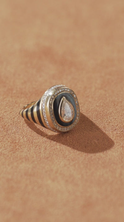 The Baret Signet Ring is a special one to the State Property family. Designed originally as the founder’s engagement ring, but also perfect as a contemporary cocktail ring, the Baret features a brilliant pear-cut diamond set upon an elongated cushion-shaped face of enamel. With its double halo of diamonds and stripes of enamel, this ring has an undeniable presence, and simply commands a yes. 18k Yellow Gold, and also available in 18k White Gold; please inquire.