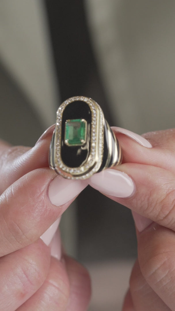 Centre Stone: Emerald-Shaped Emerald - 0.82ct. White Diamonds - 0.47ct total weight. Black Onyx. Jet Black Enamel