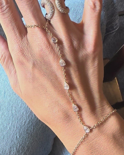 A hand chain featuring 5 pear shape natural diamonds totaling 2.00 carats, on a heavy cable chain. The perfect piece for summer.