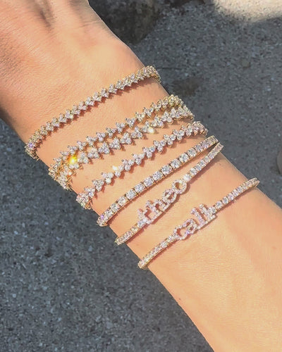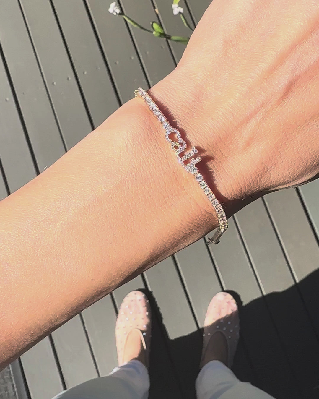 This custom name bracelet features your choice of a lower-cased diamond-set name on a tennis bracelet. A special way of personalizing a classic!