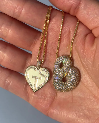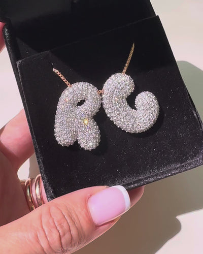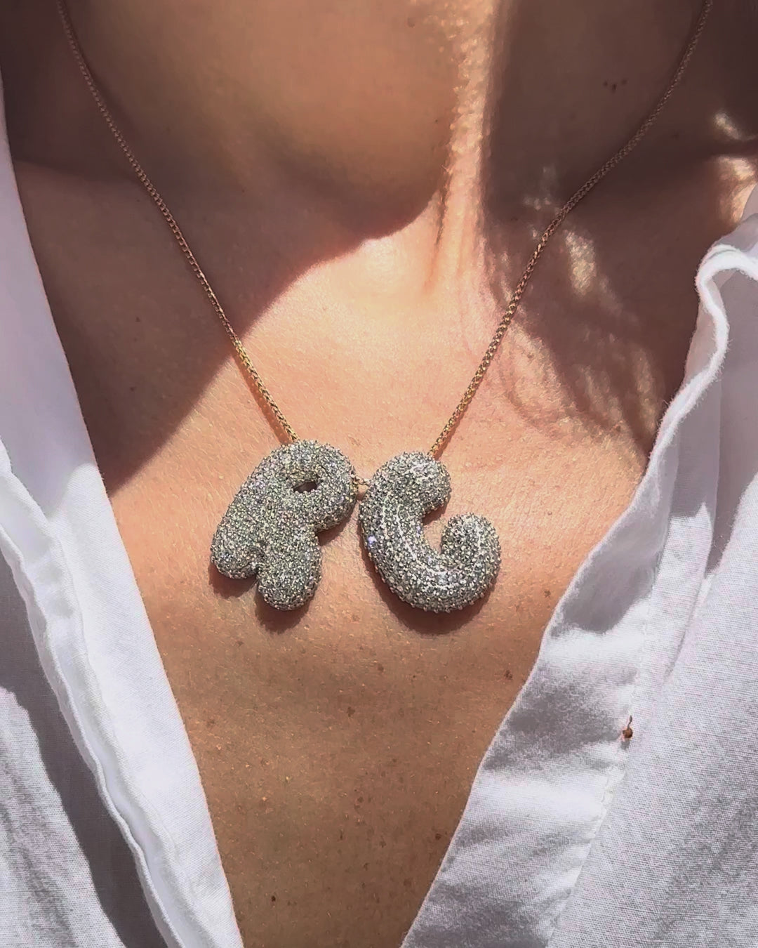 Inspired by Hailey Bieber, our large bubble letters are sure to turn heads. With a whopping 2.50-3.00 carats each letter, these beautiful diamond letters are prong set with diamonds and hang on a diamond cut wheat chain