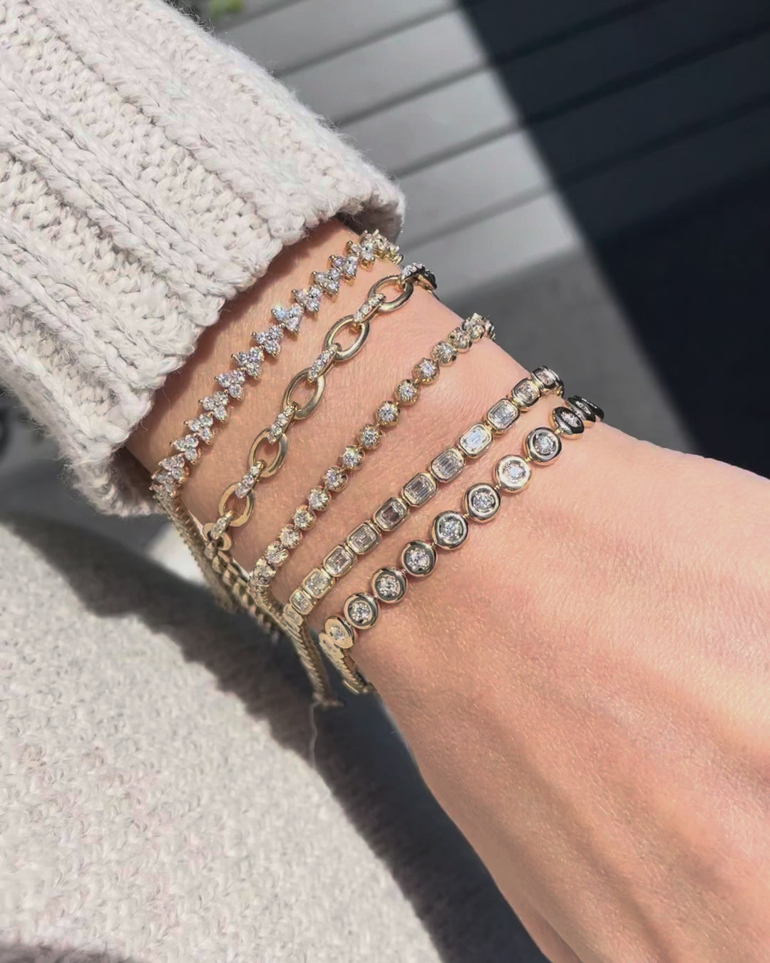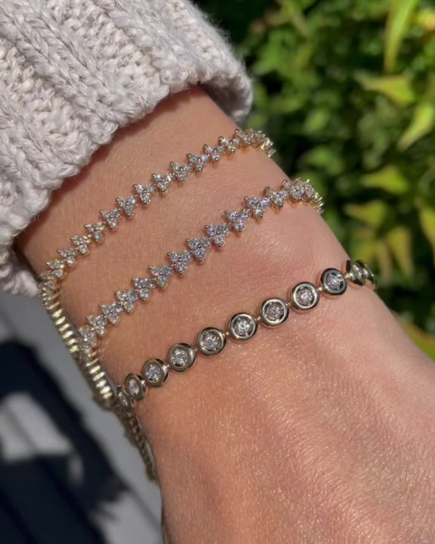This tennis bracelet features round diamonds in a triangle shaped pattern set in a prong mounting. A florally and flirty approach to a diamond tennis bracelet.