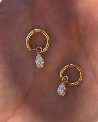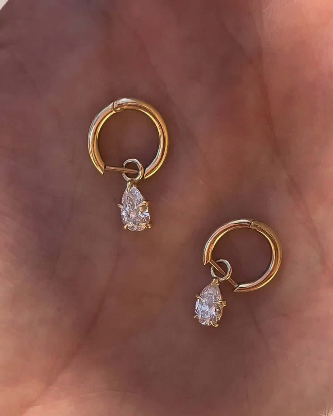 The Pear Claw Hoop Earrings feature dangling 0.50 carat pear shaped diamonds mounted in the signature claw style prongs, hanging from a gold hoop earring. Sold individually or as a pair.