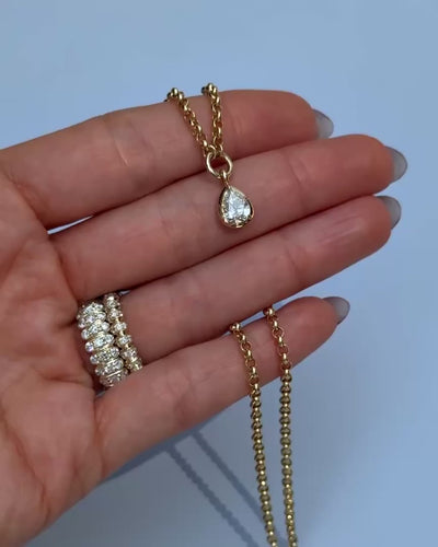 A natural pear shaped diamond set in C & H's signature Rosette collection bezel setting on a 2.7mm belcher chain.