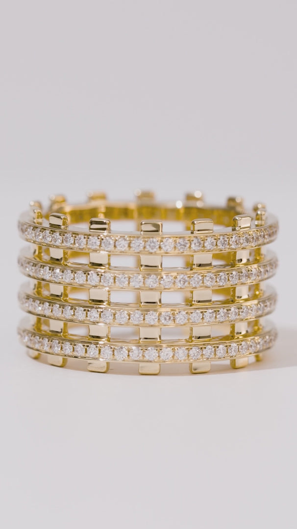 The Railroad Twin Track Pavé Ring is a contemporary riff on the classic cigar band. Two diamond-set rails run parallel across a wide band of 18K yellow gold, echoing the steady rhythm of a railway line.