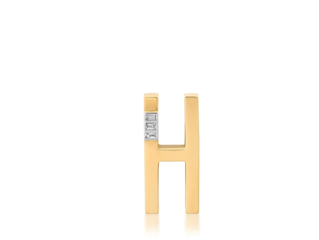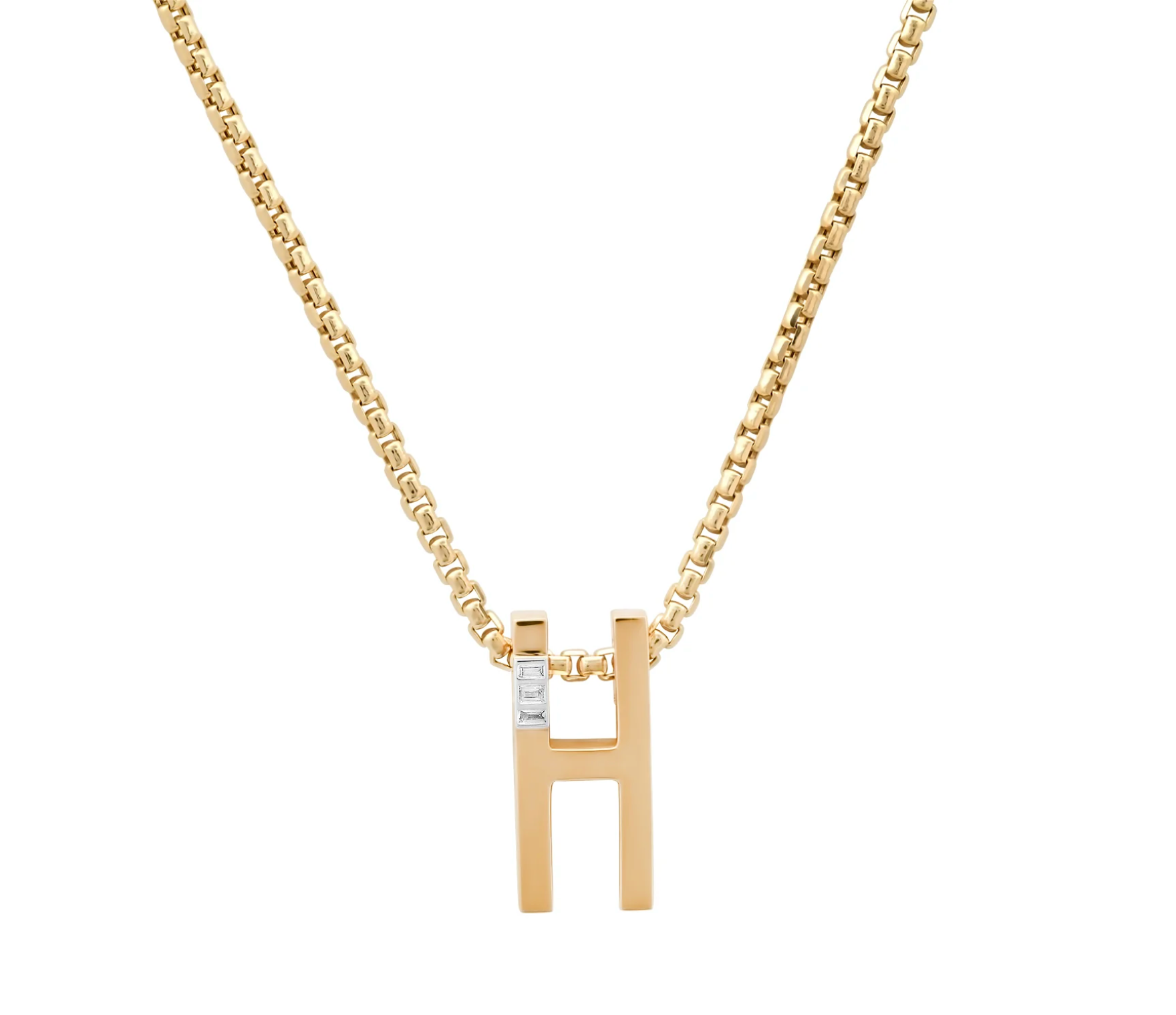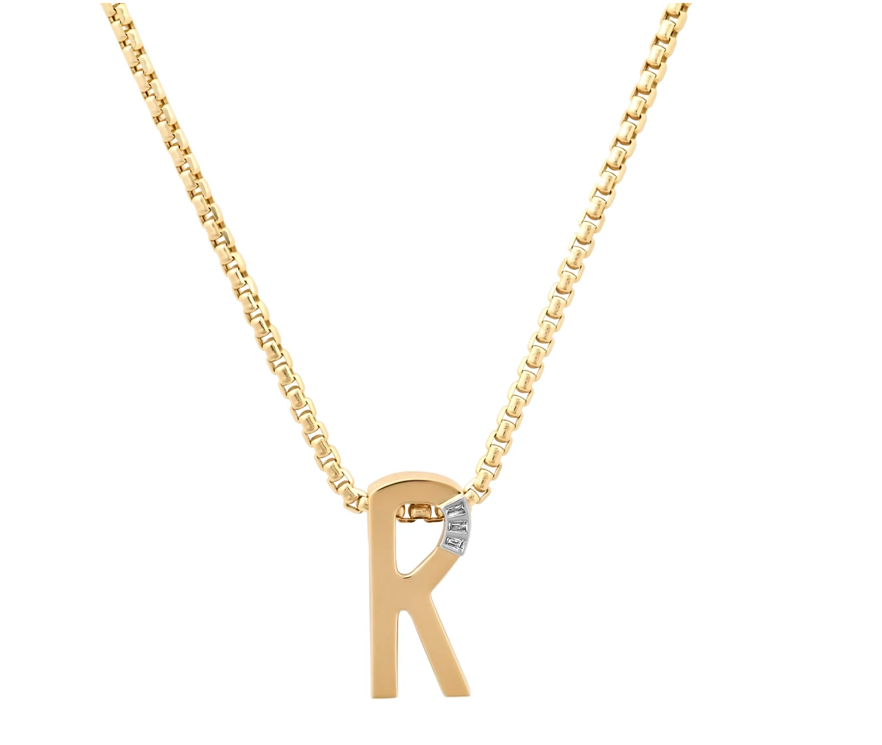 An extra-large version of the ribbed initial necklace. The grandsize ribbed initial pendant is handcrafted in 14k gold, with textured sides, and a 3 diamond baguettes. Available in 14k white and rose gold and on a 2.2 mm box chain in 16", 18" or 20"; please inquire. Final sale.