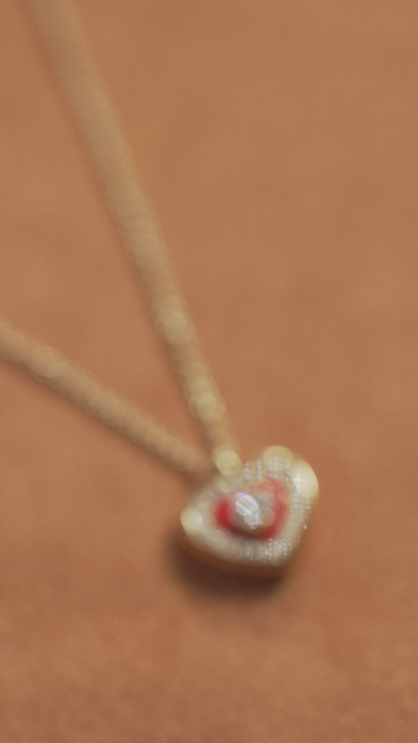 The Utama Bone Pendant is a double-sided heart-throb. Resting on the chest, this pendant with its pulsating heart element of enamel and diamonds is the perfect everyday piece. Have the pendant flipped around for a full gold and diamond look, topped off with a fanned-out texture. 18k gold.