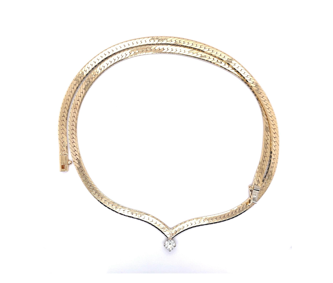 This elegant vintage necklace is crafted in 14k yellow gold and features a graceful V-shaped design set with a sparkling 0.37 carat round diamond drop at its center. Measuring 19 inches in length and weighing 14.2 grams, the necklace drapes beautifully along the neckline, offering a refined balance of sophistication and sparkle. A timeless piece that transitions seamlessly from day to evening wear. Elegant and timeless.